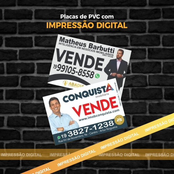 Placas de PVC personalizadas são ferramentas eficazes para imobiliárias e corretores, atraindo clientes e evidenciando seus contatos diretamente nos imóveis. Personalize com seus dados para ampliar sua presença e confiança no mercado imobiliário.